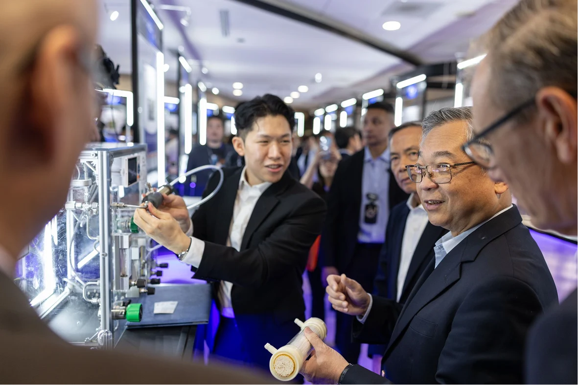 Deputy Prime Minister Gan Kim Yong at the showcase booth of AeroFlux, one of the National GRIP teams, highlighted in his remarks. AeroFlux has developed a novel membrane material that can cut the cost of carbon capture by up to 80 per cent and reduce its carbon footprint by up to 90 per cent compared with traditional technologies.